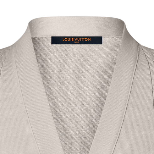 This elegant ivory cardigan is a versatile layering piece in the modern formal wardrobe. Crafted from a lustrous cotton-silk blend, it features a light and airy pointelle knit incorporating tone-on-tone bands of Monogram and Damier signatures. Combining comfort with preppy elegance, it can be worn with a suit or styled with smart chinos for a refined and contemporary look.