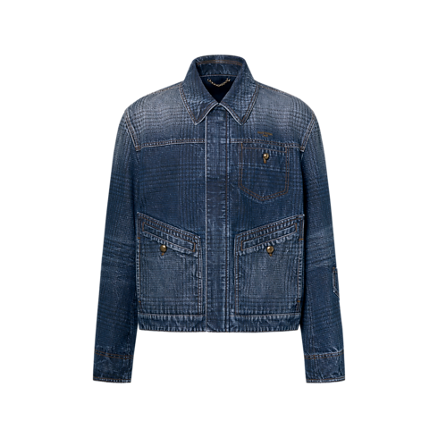 Mixing casual and sartorial codes, this workwear jacket from the Spring-Summer 2026 show features a heritage glen check printed onto indigo denim with a washed vintage finish. Louis Vuitton Paris embroidery above the breast pocket and old gold-toned buttons lend further distinction to the pared-down silhouette. Matching pants make a fashion-forward set.