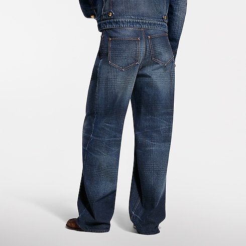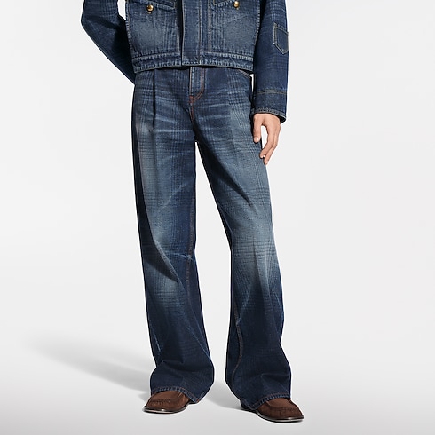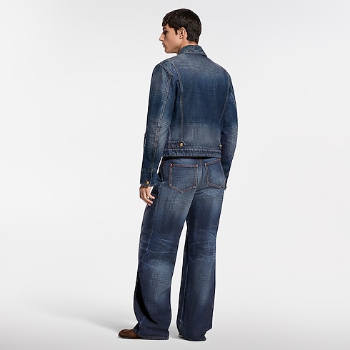 These wide-leg pants from the Spring-Summer 2026 show playfully twist sartorial codes, with a glen check, inspired by heritage tweeds, printed onto the indigo denim. The organic cotton fabric has a washed vintage finish, while the pleated front creates an elegant silhouette. Leather signature details accent the ticket pocket and belt. A matching blouson makes a total look.