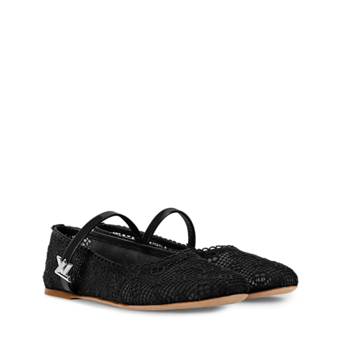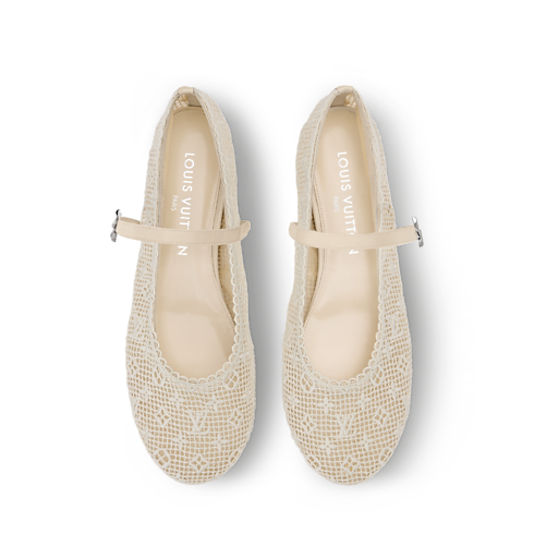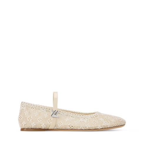 - The Romy flat ballerina is interpreted in fabric embroidered with the Monogram pattern, resulting in a pretty, lace-like effect. Scalloped edging and a patent leather strap with an LV Twist accessory complement this feminine, round-toe ballet pump, which is finished with a supple leather outsole.