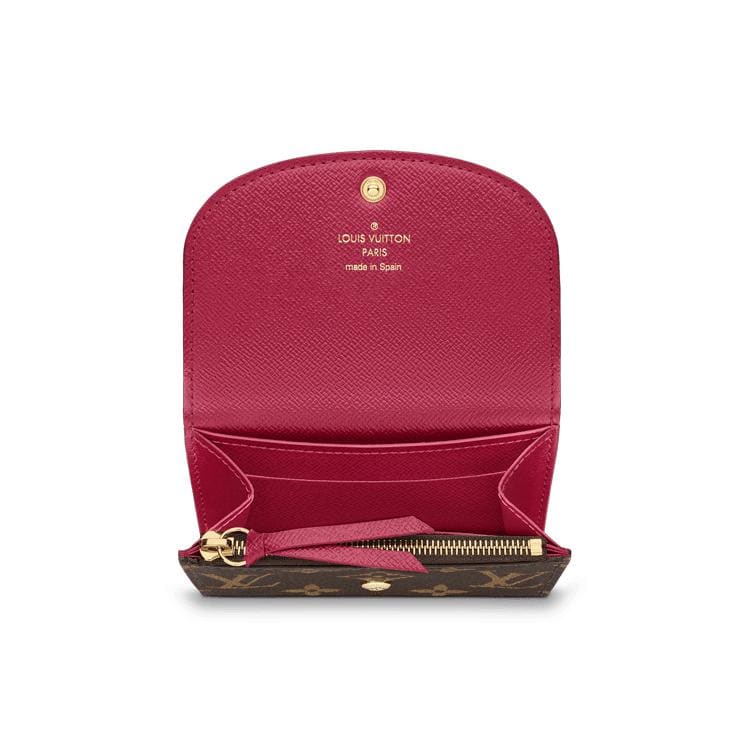 The tiny Rosalie coin purse in Monogram canvas is given a feminine feel by its colorful press-stud and grained-leather lining. For such a compact design, it is surprisingly spacious, containing a gusseted compartment, two card slots and a zipped coin pocket with a leather pull.