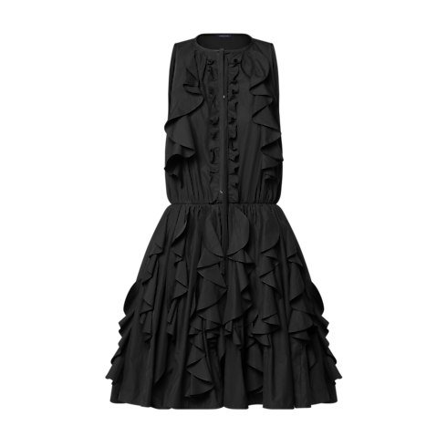 This little black dress has an airy, modern spirit in lightweight cotton poplin detailed with delicate ruffles on the chest and around the voluminous skirt. A ribbon tie adds a romantic finishing touch to the top of the button front, while a cinched waistline adds definition to the silhouette. Fastened at the side with an invisible zipper.