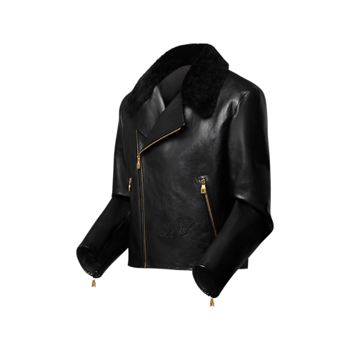 This elegant take on the biker jacket provides warmth and sophistication for colder days. The slim, slightly cropped silhouette has a pared-down aesthetic that sets off the luxurious black shearling collar. An embroidered tone-on-tone LV Ribbon motif on the supple calf leather body adds a discreet signature touch.