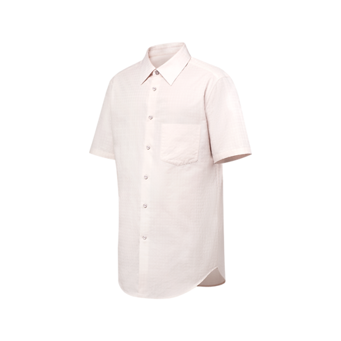 This short-sleeved classic shirt in subtle pink tones is a fresh choice for warm weather, crafted from organic cotton in a checkered Monogram Vichy jacquard. An LV top button and a woven LV and Monogram Flowers label adorn the placket. This refined piece offers a subtle play of layers paired with this collection’s softly constructed burgundy Napolitana suit.