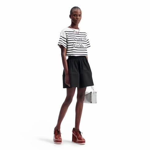 This T-shirt has a modern maritime feel in a striped knit spun from a soft cotton blend. It is crafted in a casual straight shape with a bateau neckline for elevated everyday styling. The chest is embellished with a cursive Louis Vuitton print in inverted stripes for a playful signature finish.
