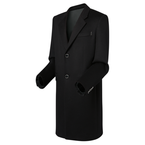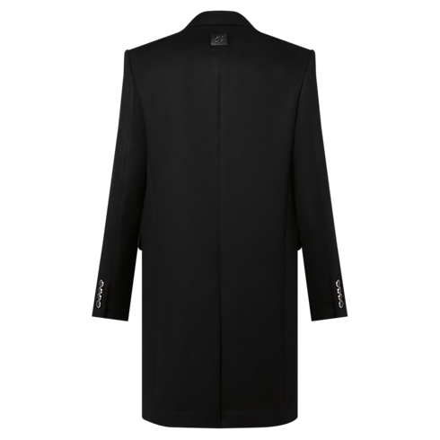 This black single-breasted coat is an essential menswear wardrobe staple. The sharply structured silhouette is tailored from luxurious double face cashmere, while signature details include a leather ‘Marque L.Vuitton déposée’ patch on the back and a Louis Vuitton-engraved Staples pin on the chest pocket. Signed metal buttons adorn the closure and cuffs of this elegant and timeless piece.