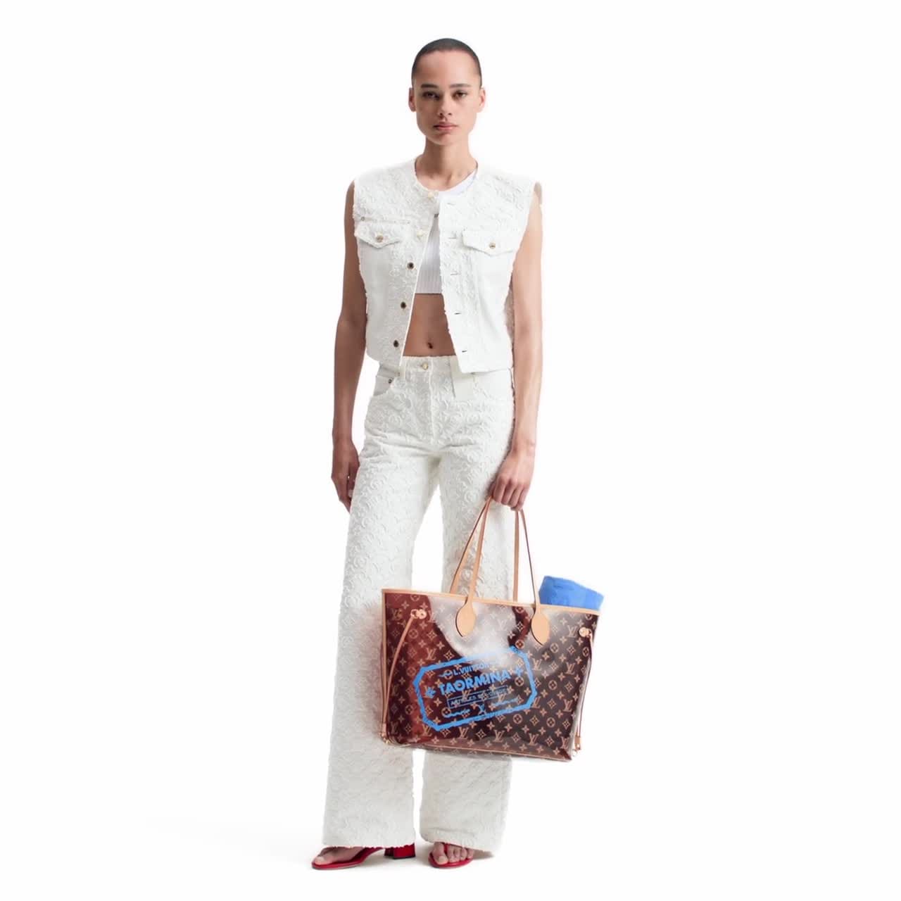 This boxy sleeveless jacket twists chic and casual codes in white denim detailed with a tone-on-tone Monogram motif in a textured fil coupé finish. Plain inserts add a structured touch to the shoulders and two flap pockets, while golden hardware completes the look with a polished accent.