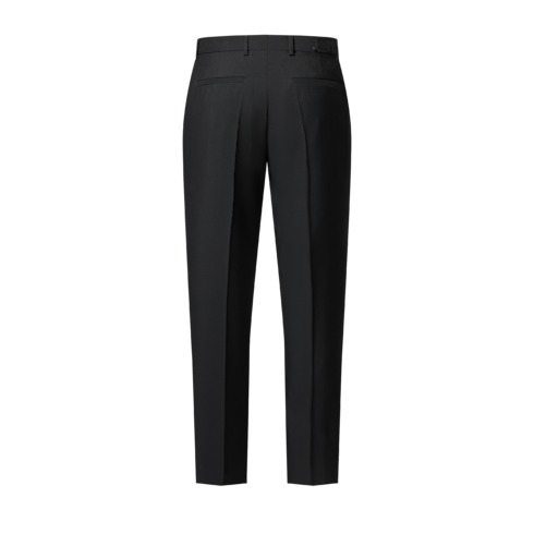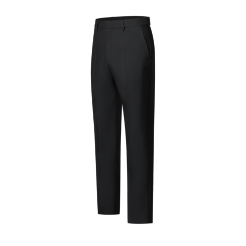 These chic black evening trousers, tailored in fine wool suiting, have a slim silhouette bringing sharp definition to formal looks. A woven tone-on-tone Marque L.Vuitton Déposée label signs the waist on the back. This timeless essential from the men’s universe can be mixed with other tailored pieces in the spirit of this collection’s unmatched suits.