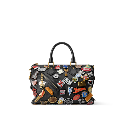 Made from cowhide leather with a waxy finish reminiscent of vintage leather jackets, the Speedy P9 Bandoulière 30 is adorned with over 70 hand-attached pins. These leather pins, featuring a rigid base and a 3D effect that mimics metal, add a unique touch. The quilted red lambskin lining enhances the bag's rockabilly vibe.
