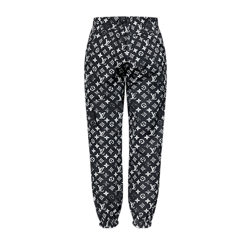 This casual piece combines a sporty vibe with a graphic Louis Vuitton signature. Tailored from technical fabric, it is adorned with the House’s iconic Monogram motif, updated with a distinctive stencil effect. Details include a hook closure, elasticated ankles and waist, and two zipped pockets on the sides.