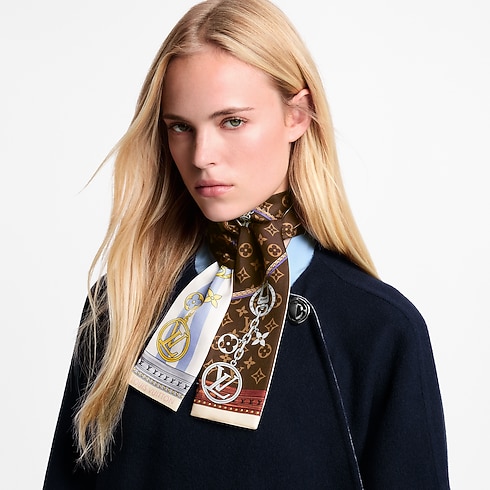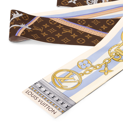 The bold design of the Strap And Trunk bandeau was inspired by the look of historic Monogram luggage from the 19th century. Printed on pure silk, it features a trunk-style leather strap plus a chain adorned with emblematic Louis Vuitton charms. An elegant, eye-catching accessory, and a tribute to the House’s heritage in the art of travel.