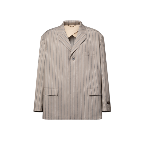 This loose-fitting, lightweight jacket with drop shoulders embodies the laid-back elegance of the Spring-Summer 2026 show. It is tailored in a beige striped wool-silk jacquard, with a striped sartorial lining in the sleeves, while a brown leather Louis Vuitton Paris patch signs the left arm. This piece can be layered with a matching coat for a runway look.