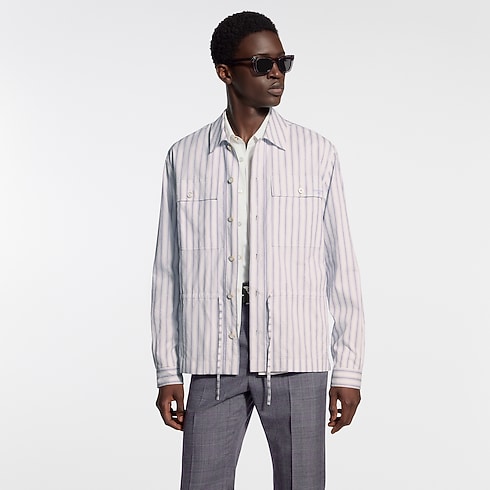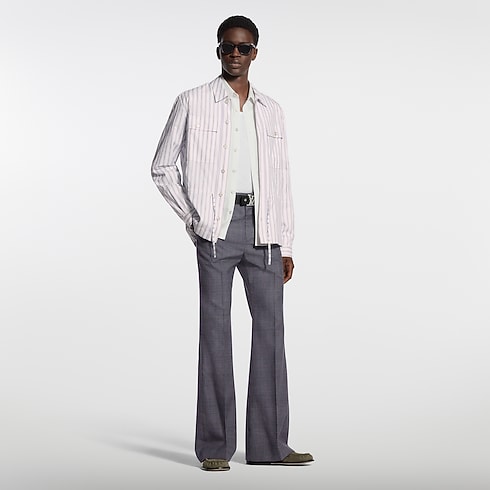 This striped cotton overshirt in subtle purple and cream tones is a versatile layering piece for this season’s relaxed elegance. It has two buttoned flap pockets on the chest and a drawstring waist. Mother-of-pearl effect buttons add a lustrous accent, while discreet Louis Vuitton Paris embroidery adorns the left chest. Pair with fluid pants for a laid-back yet elegant look.