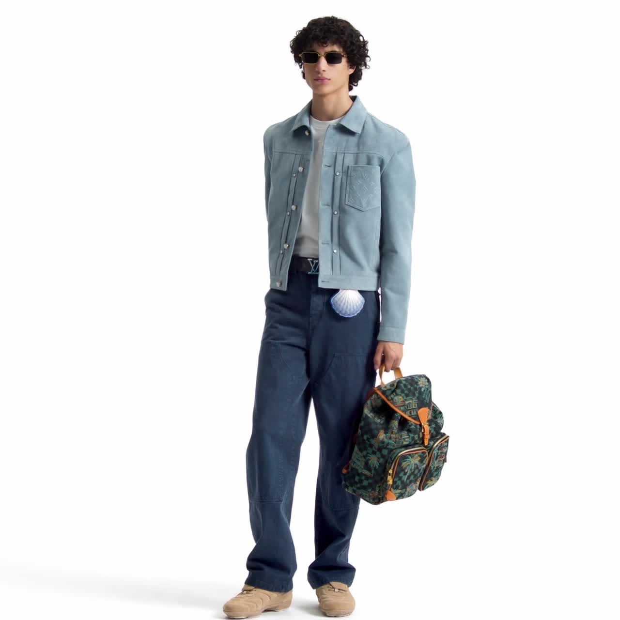 A chic twist on the Type II denim trucker, this suede jacket in smoky blue tones brings a luxurious accent to everyday looks. The soft calfskin suede is elevated with a Monogram-debossed patch pocket on the chest while a Marque L.Vuitton Déposée leather patch adorns the back. Pearl-effect buttons and rivets lend a dandy finishing touch.