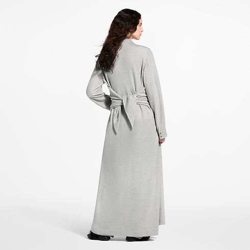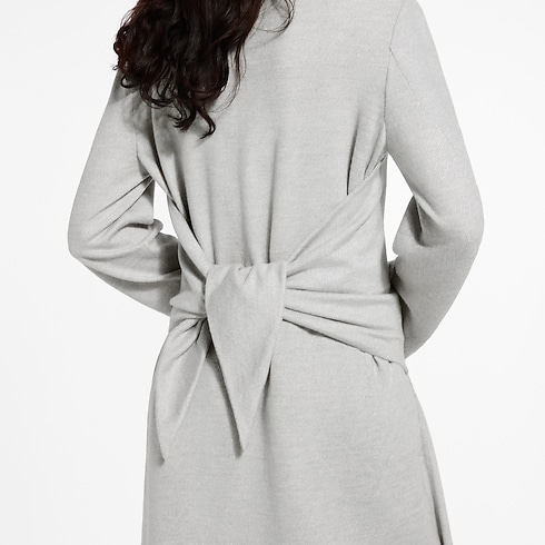 This coat from the runway reimagines the laidback look of a robe with tailored touches. It is crafted from a plush, felted wool blend that gracefully falls to the ankles in a full-length silhouette. The structured finish of the notched lapel collar and minimal geometric buttons are offset by the casual knotted ties at the back.