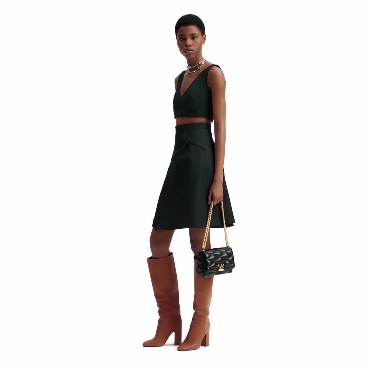 This crop top has understated appeal in the House’s iconic technical gabardine. It is cut in a streamlined, form-fitting silhouette with a sharp V-neckline that is echoed at the back. A tone-on-tone LV Circle charm discreetly signs the waistband, while an invisible zipper fastening ensures a clean silhouette.