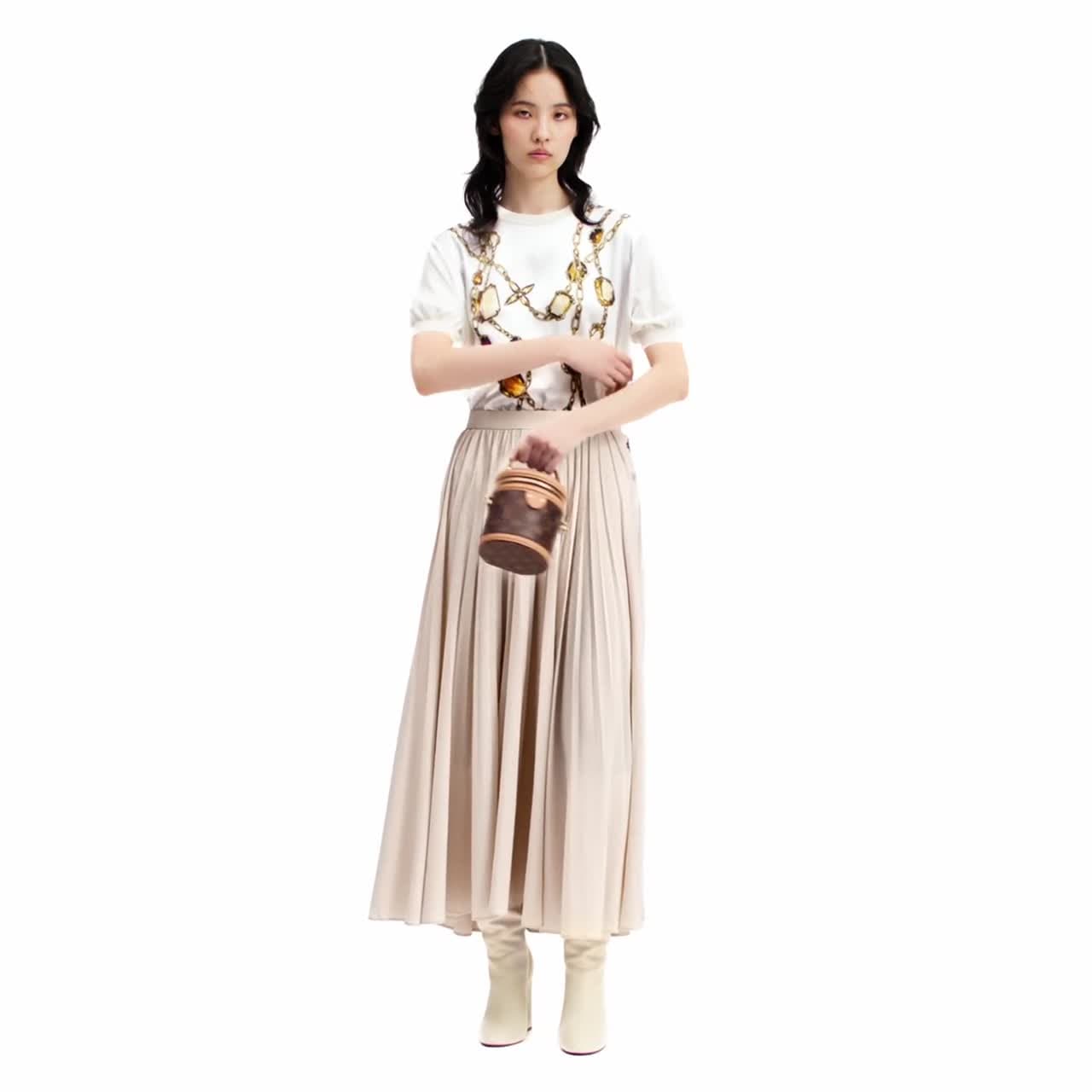 This top is playfully uplifted with the collection’s signature necklace motif printed in rich seasonal tones around the neckline for a statement trompe l’oeil effect. It is spun in a classic T-shirt shape from a fine wool knit finished with neat ribbed hems for elevated everyday styling.
