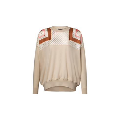 This pullover has elevated everyday appeal in a loose, loungey fit crafted from a fine wool knit trimmed with comfortable ribbed hems. The back and shoulders are highlighted in fluid silk twill featuring this season’s signature print of the inside of an archival Louis Vuitton trunk in homage to the House’s travel heritage.