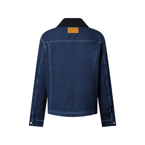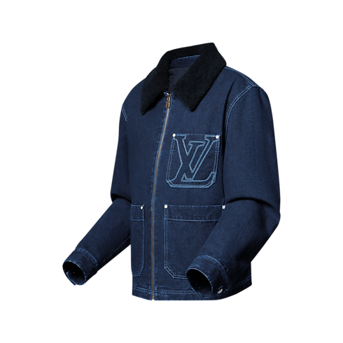 This wintery workwear jacket is crafted from exclusive Japanese denim canvas. It has a cozy shearling collar and warm Monogram quilted lining and is signed with a topstitched LV on the chest pocket and a suede LV patch on the back. Mother-of-pearl effect rivets and buttons add a dandy twist. Easy to style with everyday looks, this piece also has matching pants.