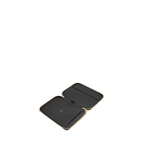The Louis Vuitton zipped document holder safeguards important papers with elegance. The outside is crafted from Monogram coated canvas, surrounded by a gold-toned zipper, and the black leather interior is equipped with an elastic piece to hold a writing utensil. Together, these simple yet sleek details display savoir-faire at the office and beyond.