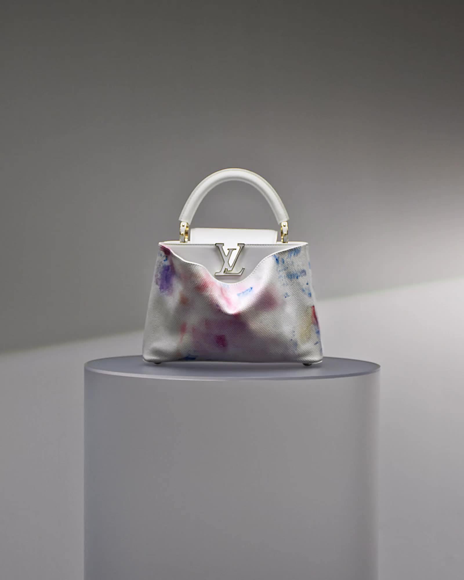 Draped in soft, carefully embossed leather, Liza Lou’s sculptural Artycapucines recalls her signature beadwork, printed in pastel hues reminiscent of her emblematic Cloud paintings. Its delicate texture offers a contrasting layer against the smooth Capucines bag, perfectly framing the iconic Louis Vuitton clasp.