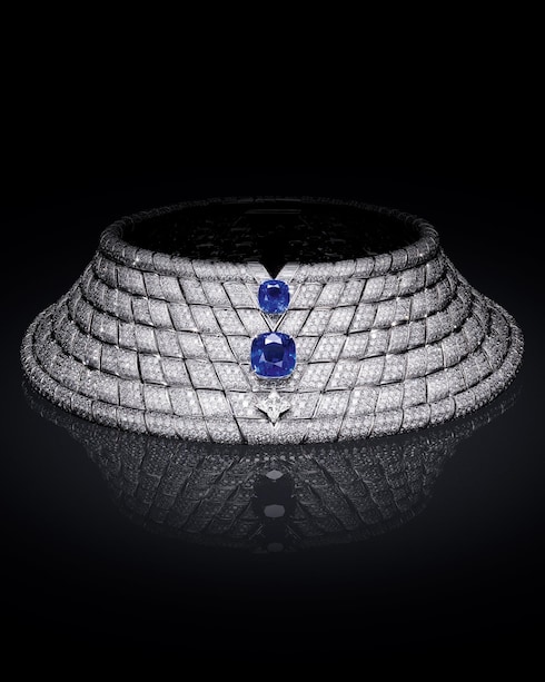 Perception reframes the era's sense of motion and rapid new pace through repeated geometric patterns — realized in mesmerising mix of diamonds. Unprecedented sapphire gem stones glow with a velvety blue hue, commanding the centerpiece.