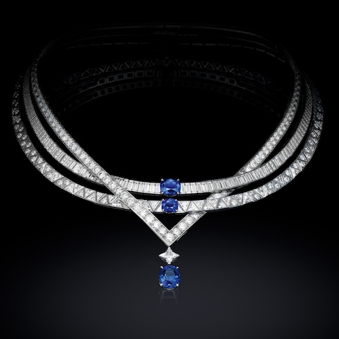 An embodiment of 19th-century scientific advancements in mobility, Gravité's precision unveils a harmonious layered effect of precious stones and metals. Perfectly balanced settings of rectangular, triangular, and round pavé set diamonds magnify the luminous brilliance of a rare assortment of hypnotic sapphires, accentuated by the House's signature V-shape.