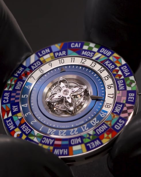 Louis Vuitton Escale Worldtime Tourbillon memadukan métiers d'art dan High Watchmaking lewat sebuah interpretasi yang menampilkan 24 zona waktu, tampil distingtif berkat integrasi city disc yang dihiasi bendera grand feu enamel serta flying tourbillon berbentuk Monogram Flower yang memikat pandangan ke pusat dial.